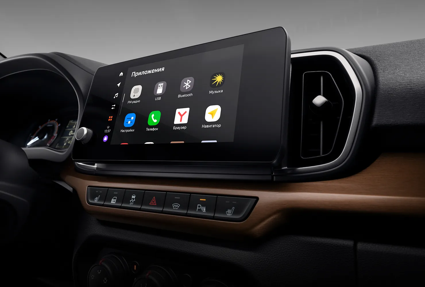 • Мультимедийная система LADA EnjoY Evo (8'' TFT-IPS ёмкостный дисплей, FM, 2USB, Bluetooth, Hands Free со сдвоенным микрофоном и функцией шумоподавления, интегрированная платформа Яндекс Авто с виртуальным ассистентом Алиса с функциями голосового управления ММС и Яндекс Навигатором), 4 динамика